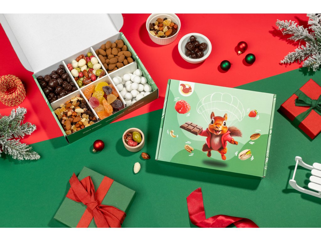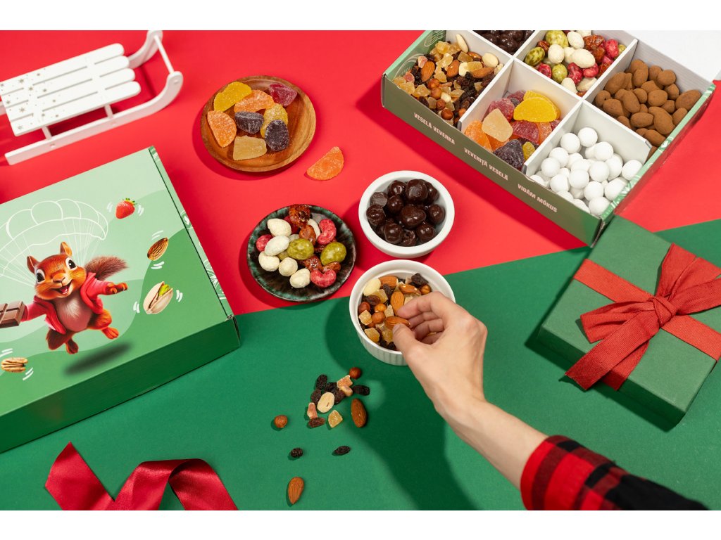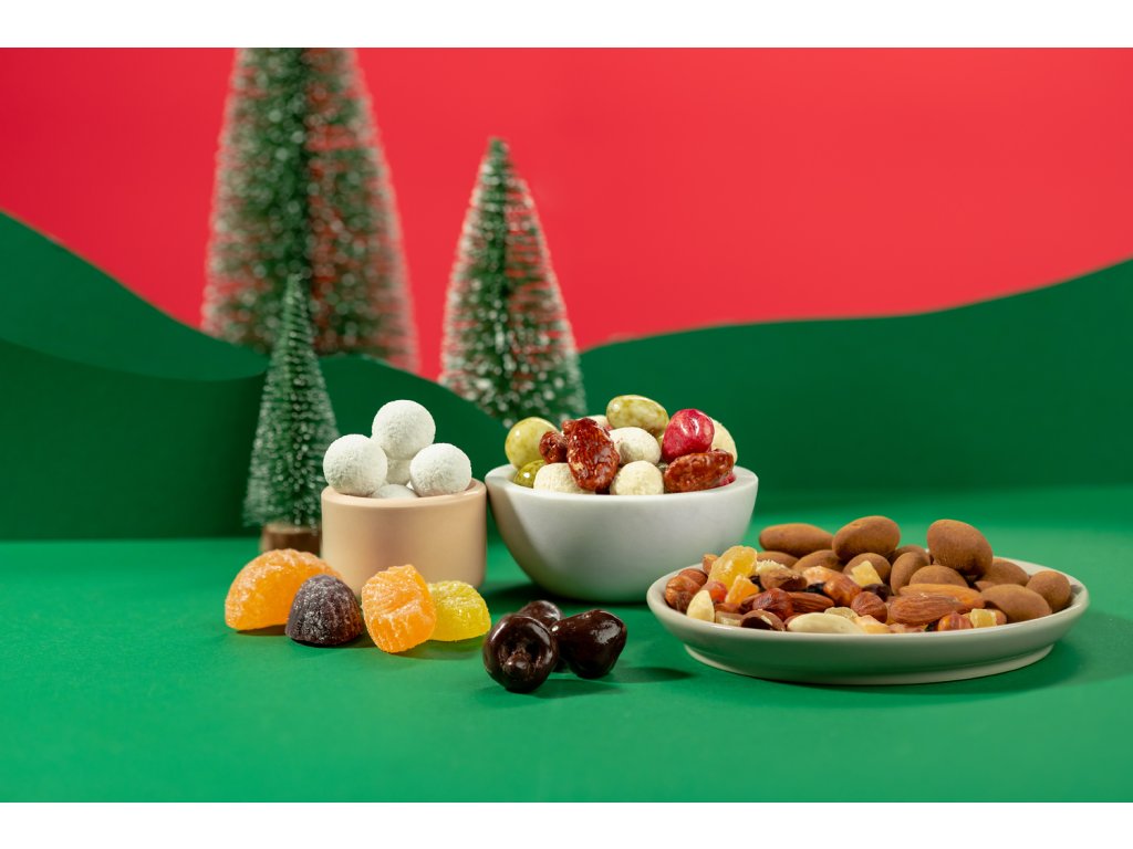 Pestrobarevná směs vánočních sladkostí – křupavé oříšky, čokoládky, kousky ovoce… prostě všechno, co si představíš pod pojmem „vánoční mlsání“.